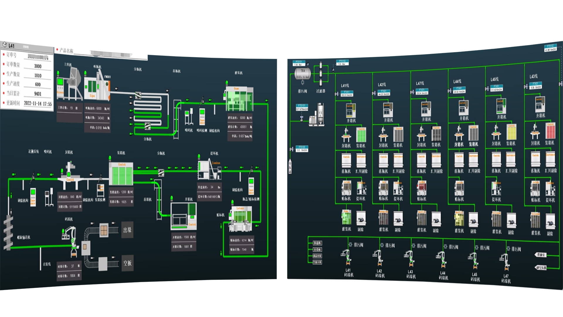 包装产线集中监控系统是基于各类油脂包装车间的监控需要,通过对此类生产线进行改造,实现对包装产线的所有单体设备的状态监视和报警汇总,同时将电耗、氮气、压缩空气等公共资源进行数据采集,进而实现对产量分析、设备损耗、设备使用效率和设备保养周期的规划和控制。