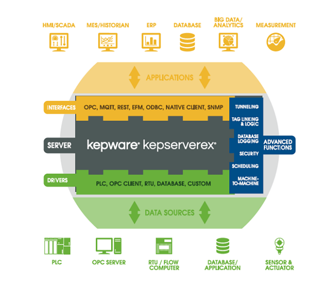 KEPServerEX具备强大的数据集成能力,提供150+驱动协议,支持市面上大部分PLC数据采集,提供制造业、电力、楼宇自动化、石油天然气等行业数据通讯解决方案。