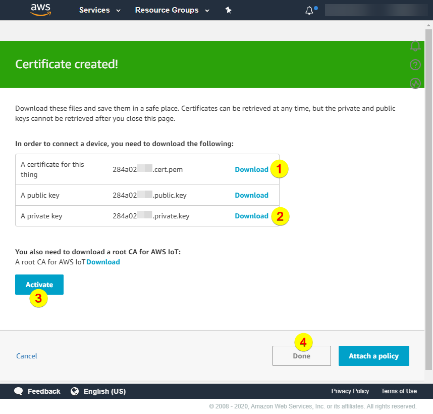 11. 输入名称 (1),输入操作“iot:*” (2) 和资源 ARN “*” (3),启用复选框“允许”(4),也许您必须向下滚动: