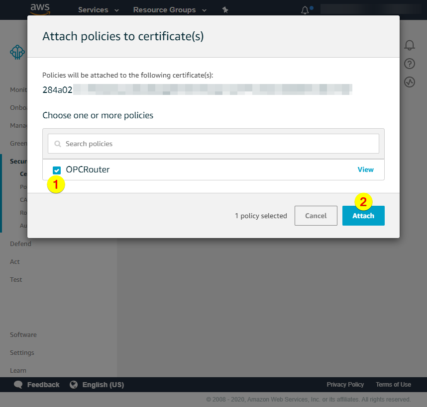 14. 启用“OPCRouter”复选框 (1) 并单击“附加”按钮 (2):