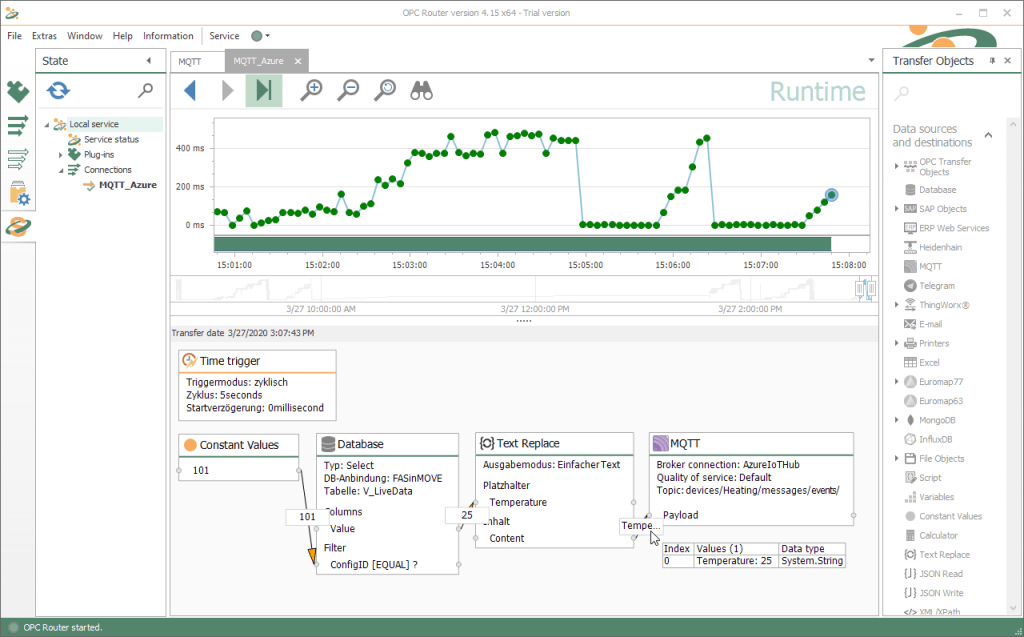 Microsoft Azure Cloud 是市场上领先的云环境之一。Azure 门户提供了许多可以轻松连接的现成服务。通过互连完成的组件来创建云应用程序。其中一个组件是 IoT Hub,它是外部数据源和 IoT 设备最重要的双向连接器。使用 OPC Router,IoT 集线器和 Azure 云可以连接起来,将数据写入 Azure 云,也可以从云中获取现场级别的数据。IoT Hub 的连接是通过OPC Router MQTT Client Plug-in实现的。通过OPC Router的各种插件实现现场级别的数据传输或云数据采购. 您可以通过访问我们的教程流找到有关此主题的专用视频。