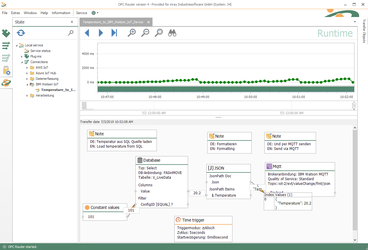 IBM Watson-Internet of Things 平台是 IBM 在 Watson 系统中的 IoT 解决方案。可以在物联网平台中创建设备。设备通过 MQTT 发送和分配当前数据。凭借其用于连接子系统的各种插件,OPC Router是 Watson IoT 平台设备的理想数据提供者。Watson 作为 MQTT Broker,与 OPC Router 的 MQTT Client Plug-in 相连。
