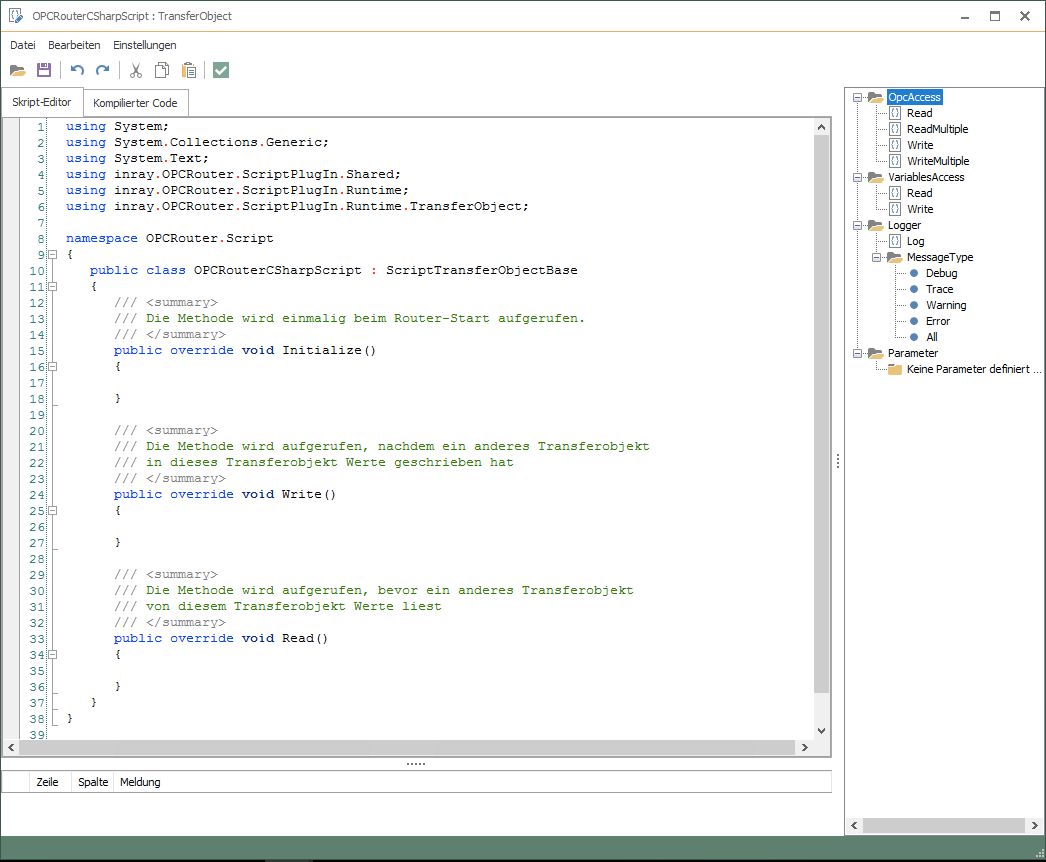 脚本编辑器可以直接在传输对象中打开,并允许轻松编辑相应的脚本。编辑器提供语法高亮。一旦你编辑了你的脚本,你也可以验证你的脚本。OPC Router的库项目可直接访问并以树形结构提供。它们已经包含所有预定义的实现方法。
