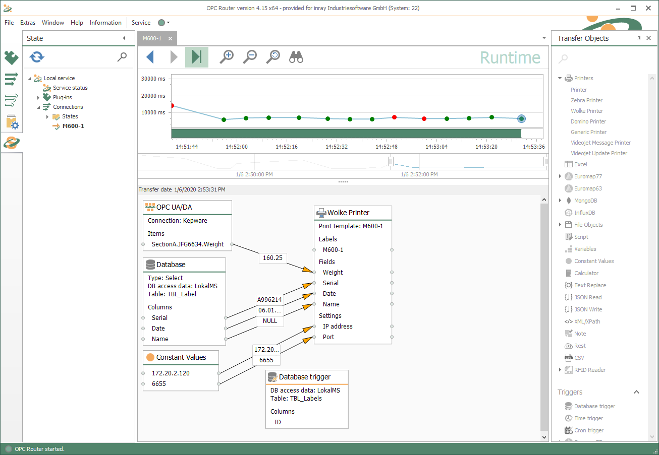 使用 Wolke 插件传递给 Wolke 打印机的标签数据的来源是灵活的。 OPC Router中可用的所有插件都可以在一个连接中使用和链接。例如,使用 OPC UA 客户端插件,可以直接从控制器获取数据。这意味着贴标机可以根据当前的生产数据在过程运行时从 PLC 获得产品贴标数据。这允许将源行、批号或机器编号等可追溯性数据应用于产品。