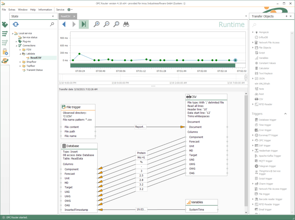 一些系统在运行过程中不断创建带有过程数据的 CVS 文件。根据内部逻辑,定期创建新文件(例如每小时或每天)。然后这些文件可供其他系统使用以接管过程数据。例如,使用 OPC Router,可以通过文件触发器顺序读取文件并通过 CSV 对象进行评估并传输到数据库。这样就实现了连续自动导入。