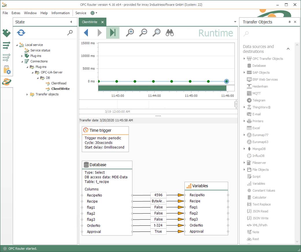 使用 OPC Router,您可以以图形方式实现系统的联网。众多插件使其成为工业环境中的中间件。简单 的配置、精密的监控和稳健性是它的标志。