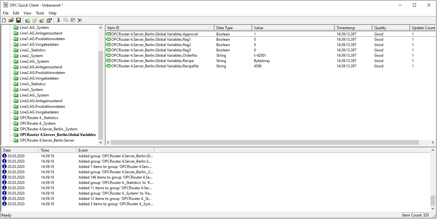 变量直接用 OPC Router连接中的数据填充,因此可以通过 OPC UA 查询它们。