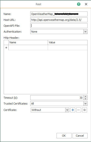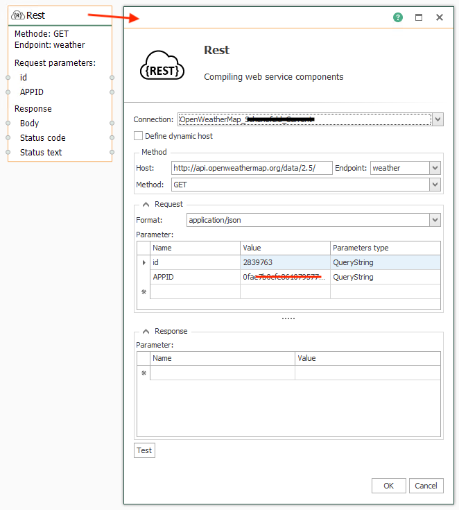 既然主机对于调用是已知的,一个 REST 传输对象就可以在使用创建的主机的 OPC Router连接中使用。然后在传输对象中选择相应的端点并确定参数。对于当前天气的检索,使用“天气”端点,在这种情况下,位置由位置 ID 确定(此处为 Schenefeld,ID=2839763)。