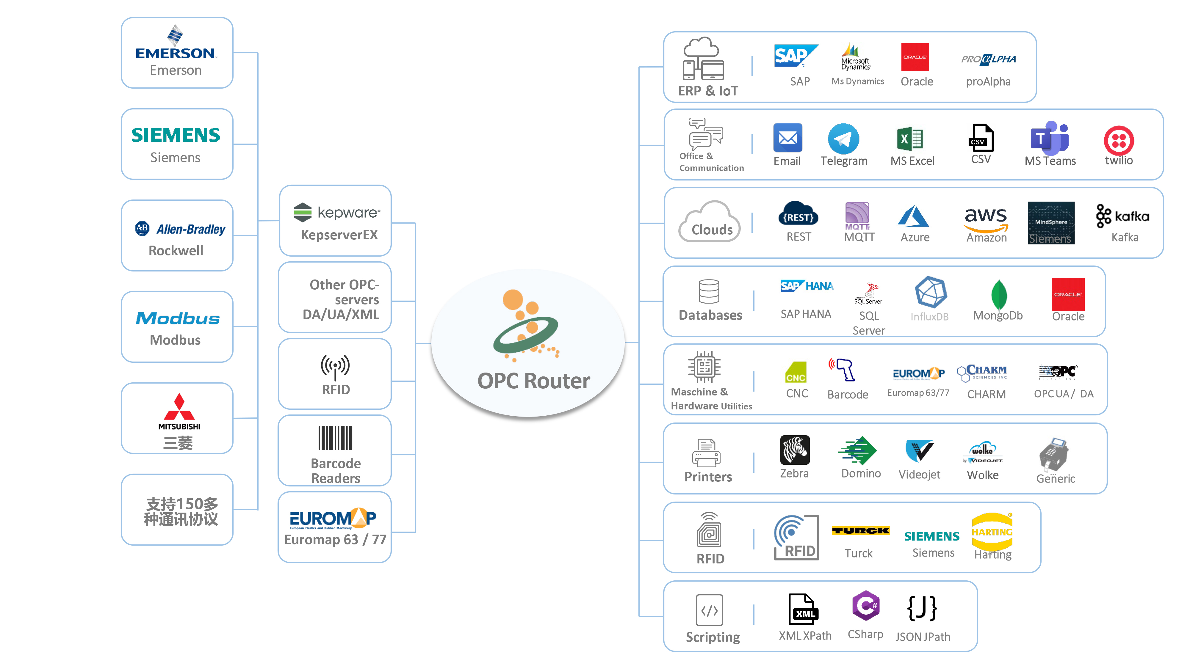 OPC Router使您能够优化和数字化您的生产过程。自动化数据交换通过 OPC UA、SAP、SQL、MQTT、REST、SOAP、Excel、贴标机等系统的集成进行。过程数据的记录使您能够持续了解您的生产情况。