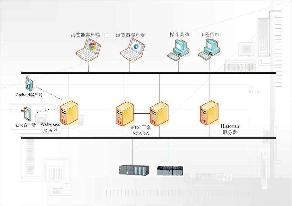 采用GE Digital Proficy iFIX中文版作为SCADA系统的基础平台,冗余的iFIX SCADA服务器完成数据采集,同时可提供OPC基金会认证的OPC Server 供外部访问。iFIX 客户端完成人机界面监视控制等操作。 Proficy Historian 存储历史数据,为人机界面提供显示历史趋势,报表查询等功能实现的数据归档。Proficy WebSpace 发布画面,支持B/S浏览器客户端,移动终端的画面监控操作。